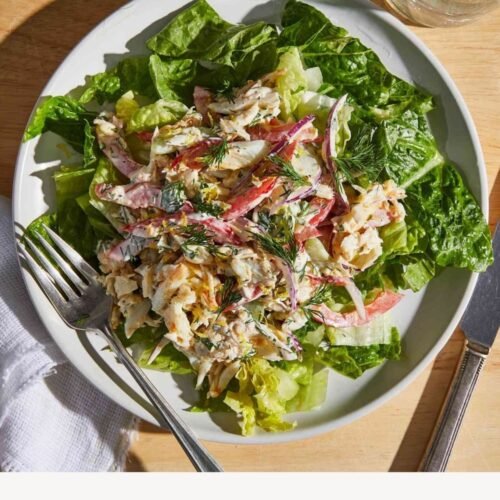 This fresh and clean crab salad sits on top of crunchy romaine lettuce with extra crunch coming from bell pepper and celery. The sweet crab is laced with a creamy dressing (thanks to Greek-style yogurt and mayo) with just a hint of Old Bay seasoning. Lemon and herbs bring it all together and brighten everything up.