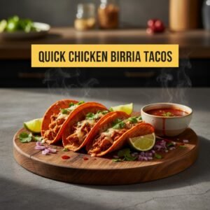 A vibrant and flavorful Mexican dish, this chicken birria offers tender meat simmered in a rich adobo sauce made from dried chilies and aromatic spices, perfect for tacos and quesadillas.